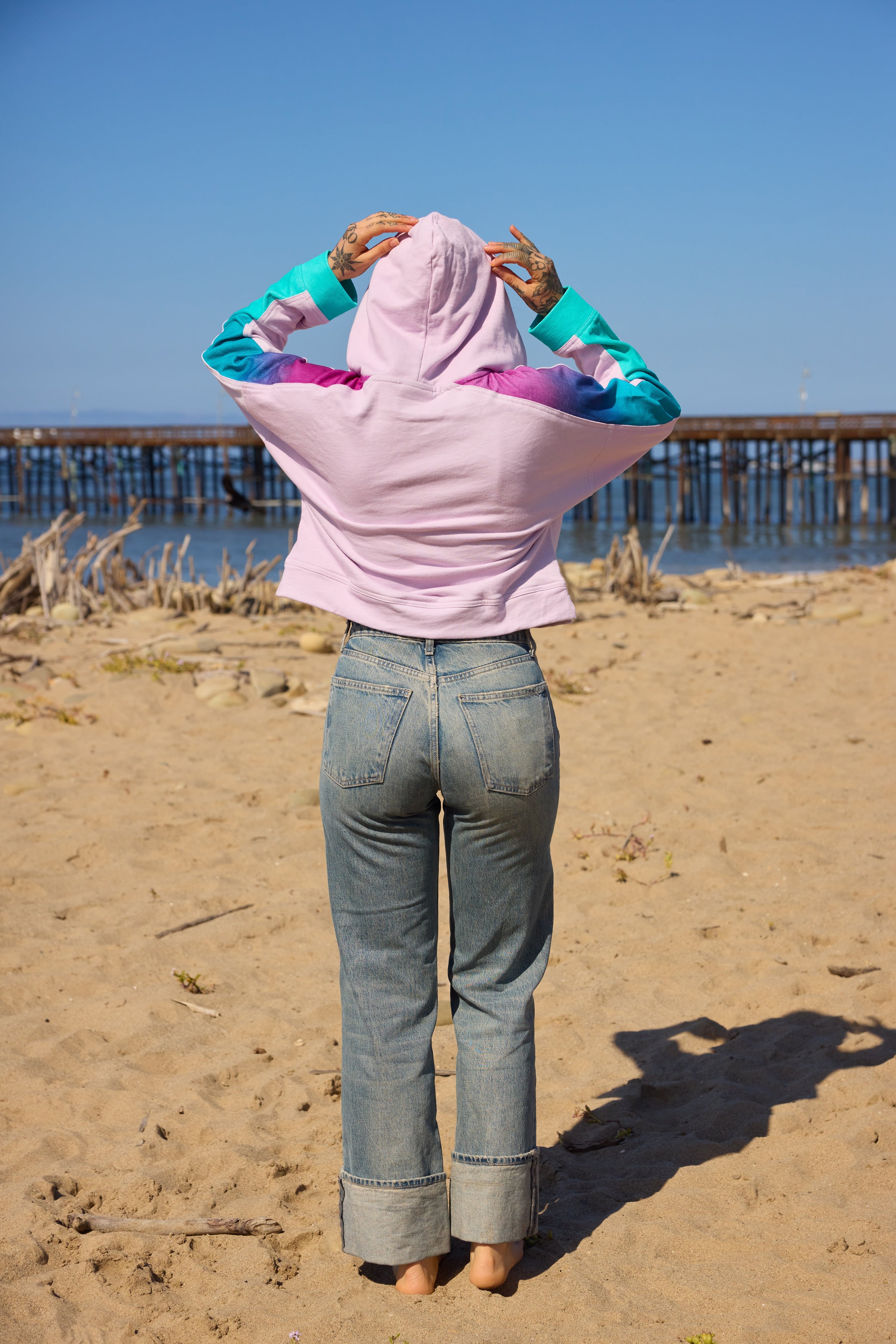 A lightweight cropped hoodie constructed with 100% cotton French terry for that perfect layer. Features a front kangaroo pocket, hidden zipper pocket, and custom Mokuyobi molded snaps. Hand airbrushed gradient sleeve, cuff, drawstring, and welt pocket details.